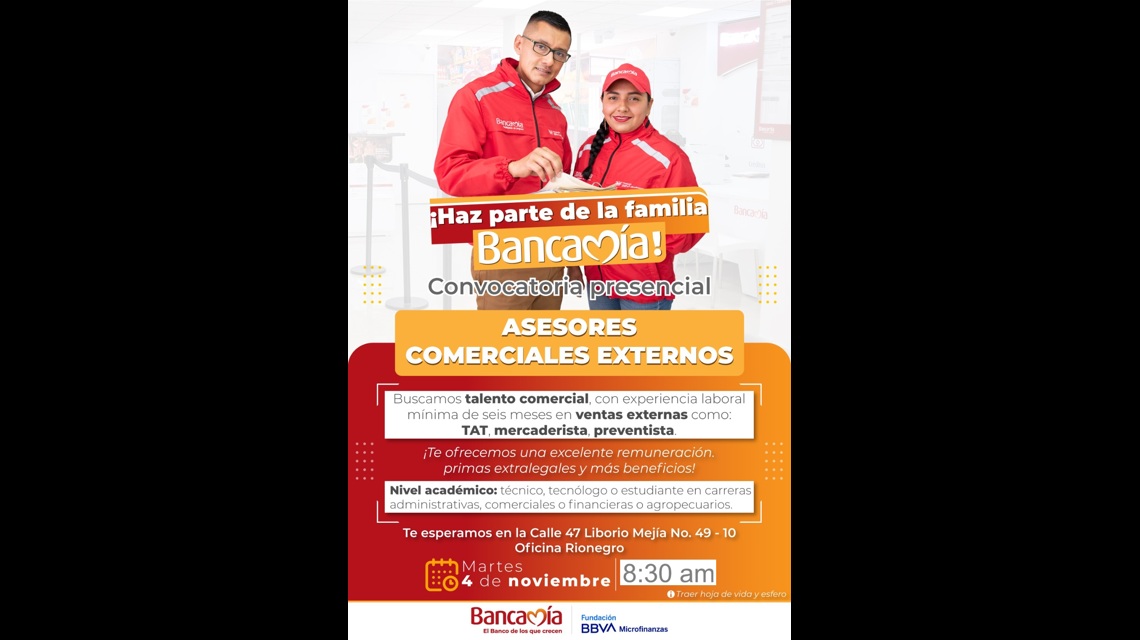 ¿Te gustan las ventas en calle, hablar con gente y ver cómo tus clientes crecen con crédito bien colocado? En Bancamía buscamos talento con actitud comercial.